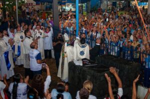 Após a bênção final, o momento mais esperado da noite marcou oficialmente o início das festividades: a bandeira, trazida durante a procissão, foi solenemente hasteada diante dos fiéis. O gesto anunciou que a Festa do Morro 2025 começou, dando abertura a uma programação que seguirá até o dia 8 de dezembro com missas, shows, procissões e atividades culturais.